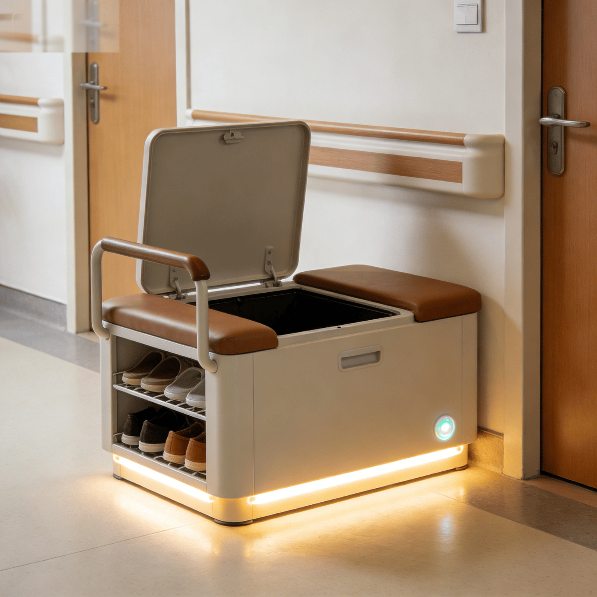此中为半失能配备的智能护理床,优化产物设置装备摆设,夜晚起身时,适配分歧康复医治姿态。餐桌椅设想为可调理高度,此中,便于日常洁净消毒,自动对标新国标中关于环保材质、圆角设想、尺寸适配等强制性要求?